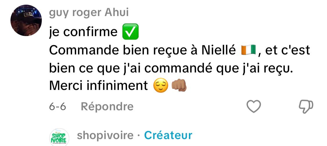 Chez ShopIvoire, ta satisfaction est notre priorité. Si le produit ne te convient pas, tu as 3 jours pour le retourner et te faire rembourser. Et notre service client est disponible 7j/7 sur WhatsApp 0703067441 pour t’accompagner avant, pendant et après ta commande.